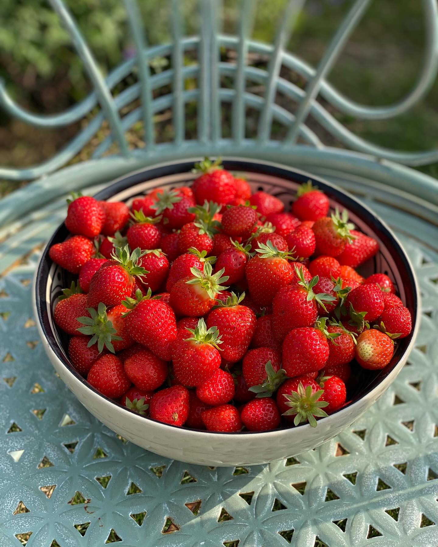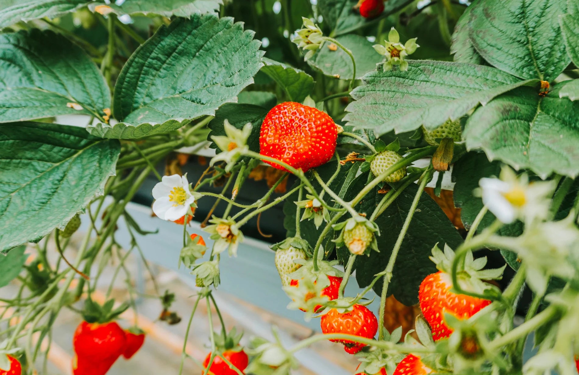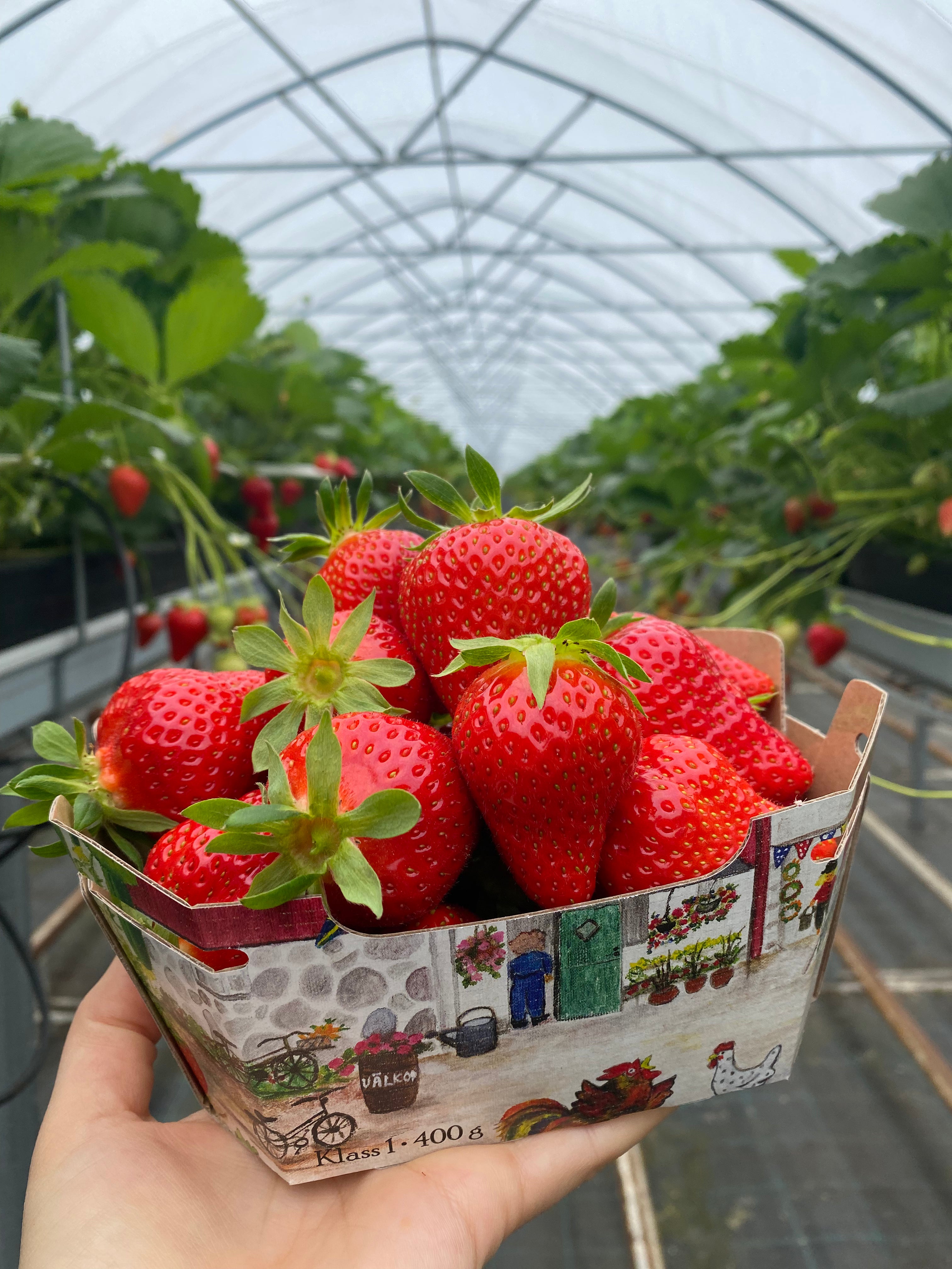 Eftersom vi använder remonterande plantor, som blommar hela säsongen, kan vi skörda jordgubbar från slutet av april till in i september.